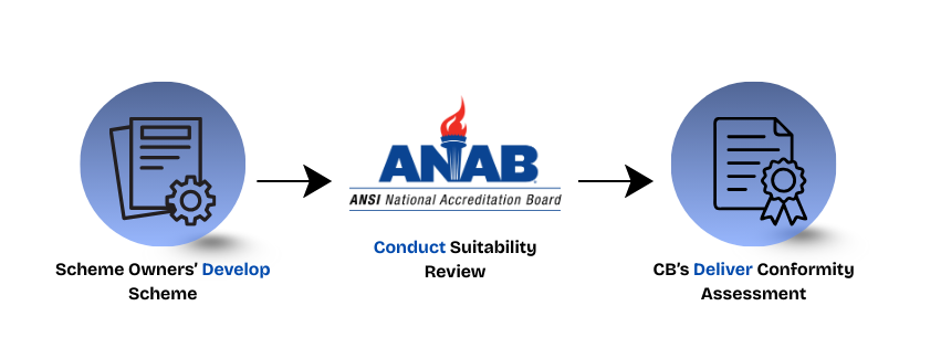Scheme Owners define industry-specific certification criteria, drive innovation in conformity assessment, and translate standards into market-relevant requirements that support third-party conformity assessment. ANAB provides internationally recognized accreditation that ensures scheme credibility and alignment with ISO/IEC 17011, while evaluating both scheme suitability and implementation.